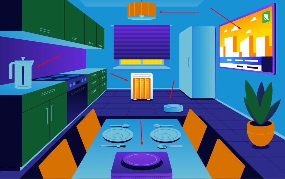 - "Мне холодно" - кликаем на обогреватель, а затем кликаем на электрический чайник;
