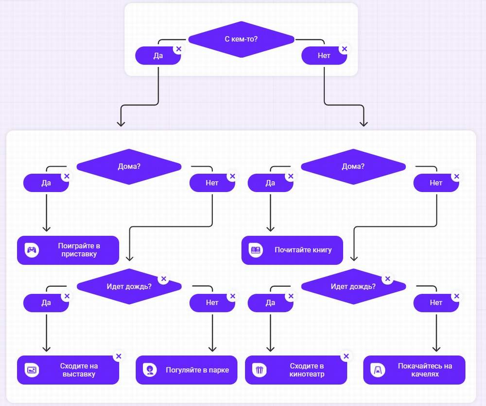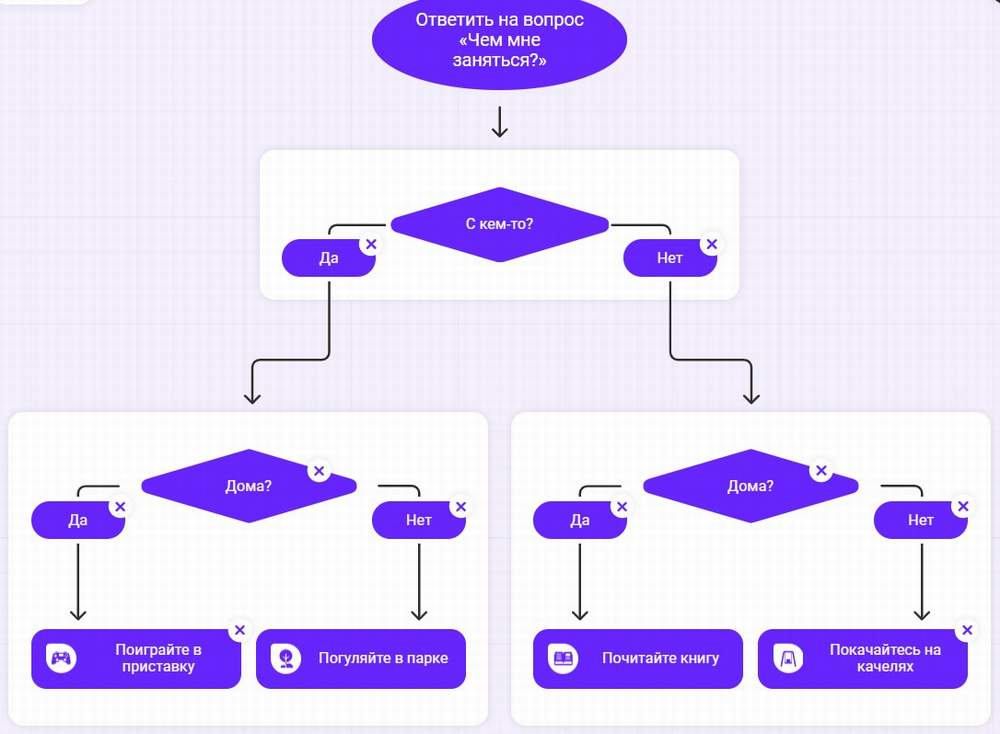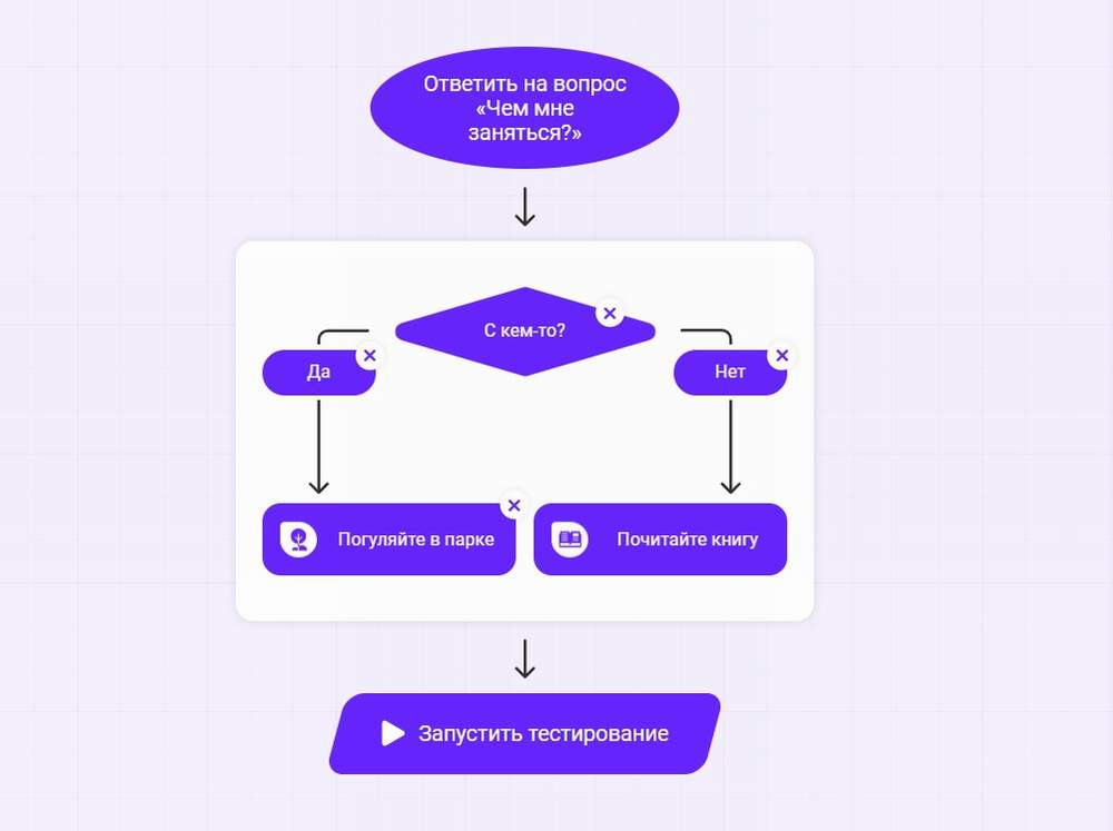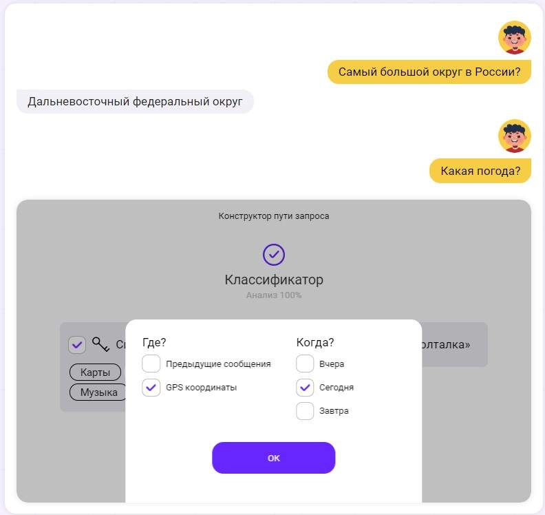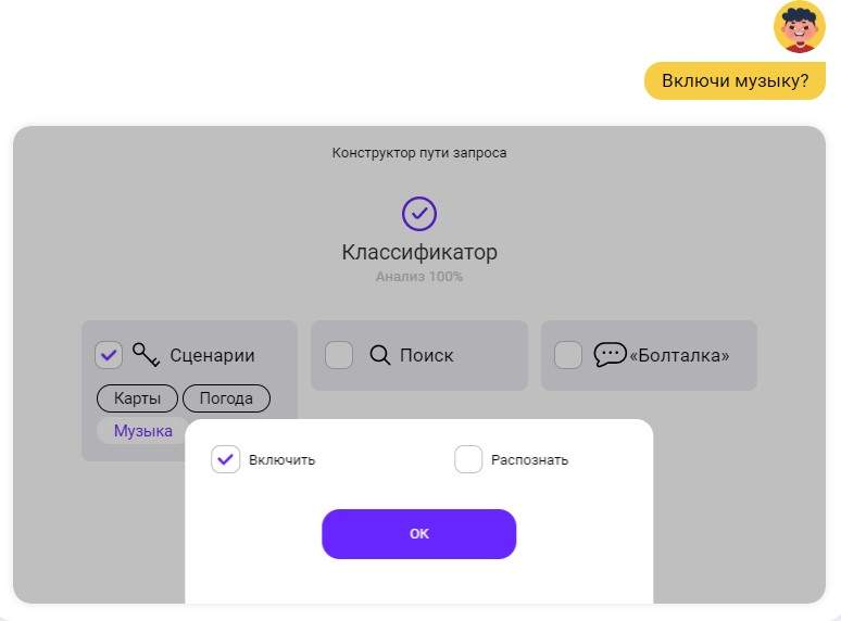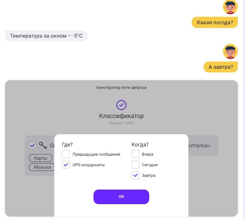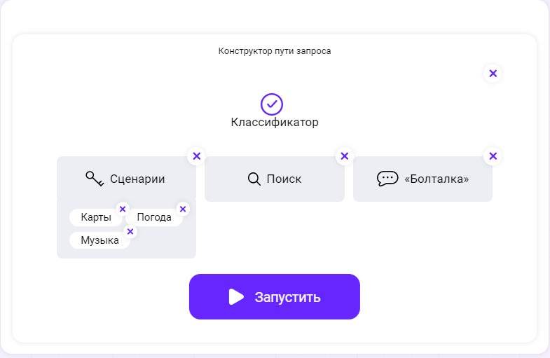 Теперь нам предстоит собрать из блоков конструктор пути запроса. Нужно собрать конструктор так, чтобы голосовой ассистент выдал подходящий ответ на заданный вопрос. Необходимо добиться уровня удовлетворенности в 99%. Наше виденье ситуации следующее.