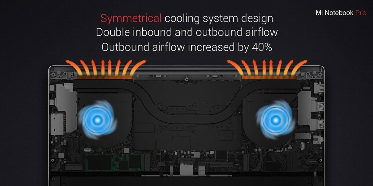 Поскольку ноутбук является ничем иным, как рабочей лошадкой, то и его охлаждение должно быть соответствующим. Честно говоря, греться в ноутбуке особо нечему, так как все железо свежее и холодное, но при длительной нагрузке даже самые энергоэффективные компоненты начинают работать на максимуме возможностей, из-за чего нагрев неизбежен. В Xiaomi решили проблему перегрева путем установки сразу двух мощных кулеров, которые эффективнее системы охлажения в предыдыущих Mi Notebook Pro на 40%. В общем, без преувеличения можно сказать, что Сяоми выпустила не только мощный, но и эргономичный и сбалансированный девайс, который обязательно стоит приобрести.