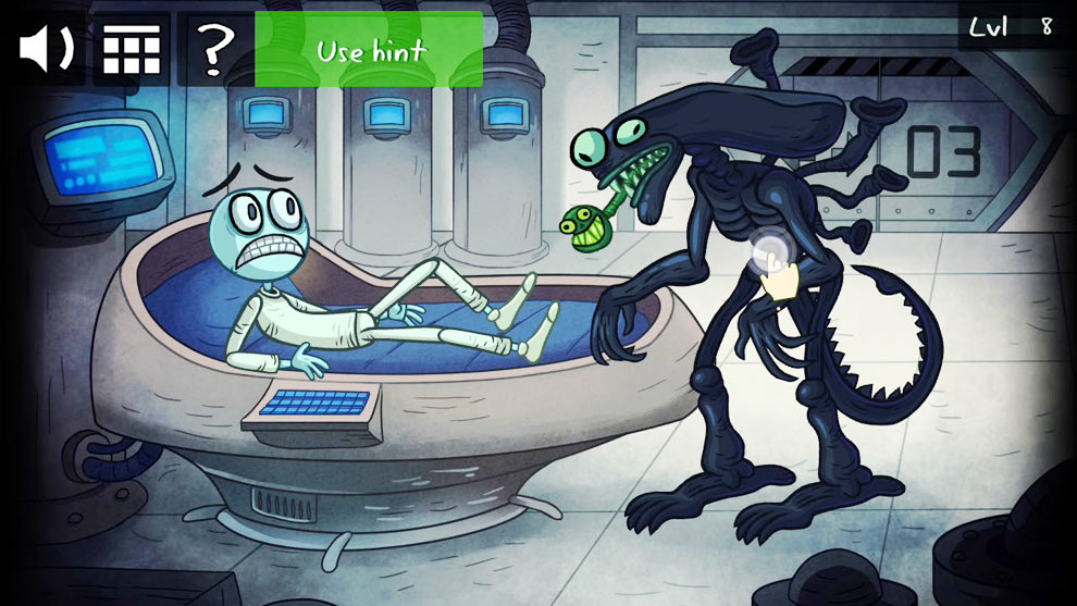 Тролл Фейс Квест Хоррор прохождение 8 уровень – ждём пока тролл испугается Чужого, а затем тапаем и удерживаем палец на животе чужого. Конец сценки спойлерить не будем.