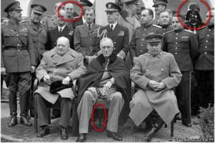 Чёрно-белая старое фото с Ялтинской конференции стран, которые воевали против Гитлера. Здесь найти фотоляпы сможет только посвященный человек. На первом плане сидят Сталин, Рузвельт, Черчилль.
