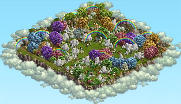 ВНИМАНИЕ! Радужное поселение будет доступно только 5 дней с момента его первого посещения. Так что если у вас не достаточное количество энергетиков, чтобы успеть за это время все там почистить, и не достаточно каши с рыбой, чтобы отвезти сокровища домой, не стоит спешить в Радужное. Прежде чем ехать туда, насобирайте хотя бы 2000-3000 хлеба. Попав в радужное, вы получите задание. Необходимо будет отыскать на локации 10 радуг (скриншот ниже) и погрузить их в сани, взамен вы получите 5 Коллекционных подарков. Так же на не забывайте все радужные кусты и радужные деревья этой локации разбивать только комбо, получая радужные гнезда, с которых выпадают желтые, красные и синие листья. Они вам понадобятся в следующих обновах.