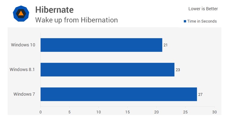Режим гибернации - как быстро компьютеры засыпают/просыпаются. Обычно, чем старше система, тем дольше она переходит в режим гибернации. На практике теория подтверждается - разница между нашими системами 6 секунд в пользу Win10.