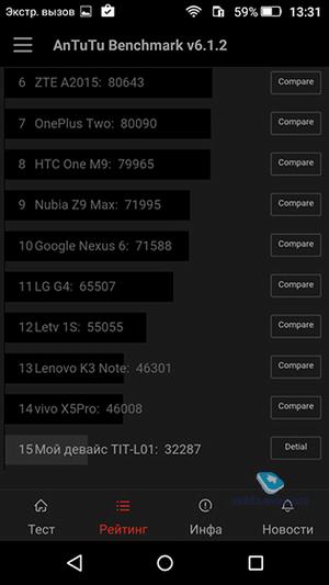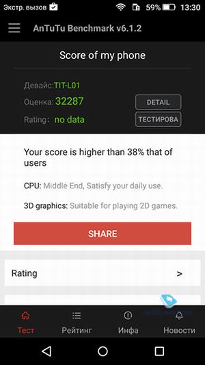 Сердцем смартфона является процессор от MediaTek MT6735, ядра которого трудятся на частоте до 1300 Мгц. Ожидать каких-либо ошеломляющих результатов от него не стоит, поскольку бюджетник на то и есть бюджетник. Однако, благодаря небольшому разрешению экрана, Антуту-тестер оценил Хонор 4C Pro в 32 287 баллов. Оболочка, да и вообще ОС Андроид, чувствуют себя прекрасно, без лагов и подтормаживаний. В тяжелые игры, конечно, не поиграешь, а вот в аркадные или хорошо оптимизированные игрушки - без проблем.
