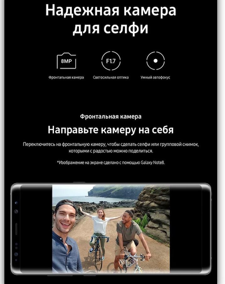 Если мы говорим о фронтальной камере, то Галакси Ноте 8 является лучшим селфифоном за счет использования камеры с разрешением 8 МП, светосилой оптики f/1.7 и умного автофокуса Smart Auto Focus для захвата лица.
