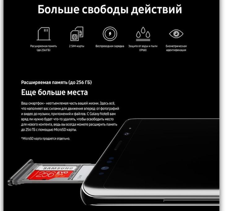Наконец и в Самсунг поняли, что оперативной памяти много не бывает. Теперь в паре с процессором Qualcomm Snapdragon 835 имеется целых 6 ГБ ОЗУ, при этом других версий смартфона с иным объемом энергозависимой памяти нет. Что касается встроенного накопителя, то тут все отлично - минимум пользователю доступно 64 ГБ, далее идет 128 ГБ, а максимальный объем ПЗУ составляет 256 ГБ. Более того, поддерживаются и карты памяти объемом до 256 ГБ. В общем, теперь Galaxy Note 8 соответствует всем критериям флагмана.