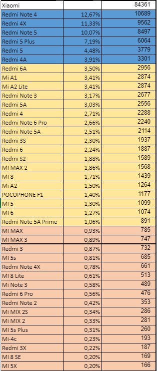 В этой статье мы рассказали вам, какими же смартфонами Samsung пользуются посетители нашего сайта. В сегодняшней статье мы расскажем вам о выборе людей среди смартфонов Xiaomi, а в следующей поговорим о девайсах Huawei. В таблице ниже вы можете увидеть общую картину, но более детально мы поговорим о десяти смартфонах Xiaomi и постараемся объяснить, почему выбор людей пал именно на них.