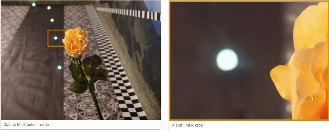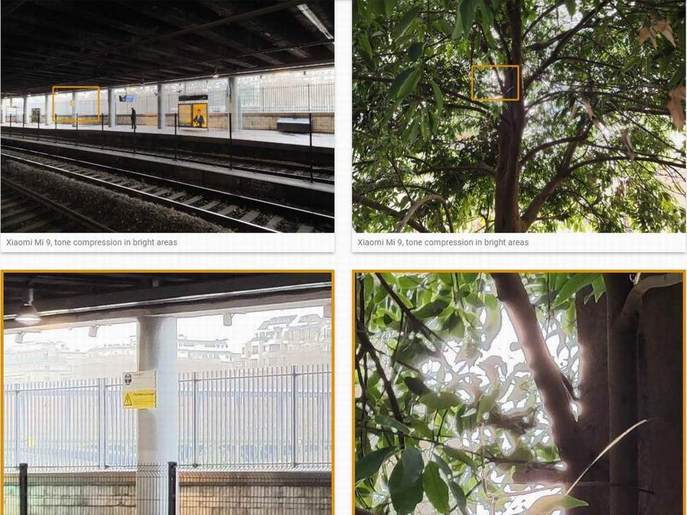 Наиболее распространенные артефакты, такие как хроматические аберрации и ореолы, на Сяоми Ми 9 появляются редко. Тем не менее тестеры нашли несколько артефактов, которые невозможно найти на других устройствах. Например, яркие области в высококонтрастных изображениях показывают очень низкий контраст (это называется сжатием тона), что приводит к довольно неестественной визуализации этих областей. Эффект очень заметен на ярких фонах на изображениях, представленных ниже.