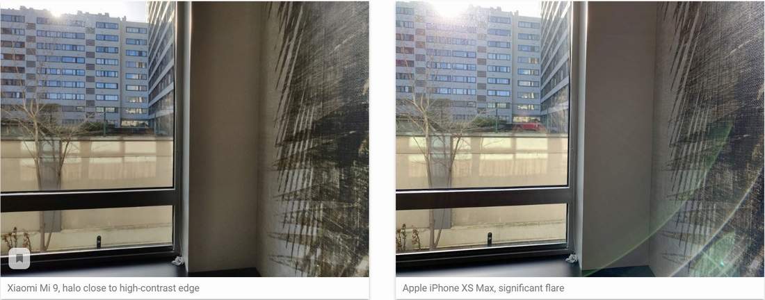 Также можно наблюдать своего рода темный ореол вдоль некоторых высококонтрастных краев. В примере ниже на Сяоми Ми 9 стена справа от окна очень темная, прежде чем начинается переход до более яркого тона. В iPhone XS Max (изображение справа), фото намного ближе к реальной сцене, тоны стены переданы гораздо более правильно. С другой стороны, Сяоми Ми 9 не засвечивает фото, в отличие от iPhone в этой конкретной сцене.