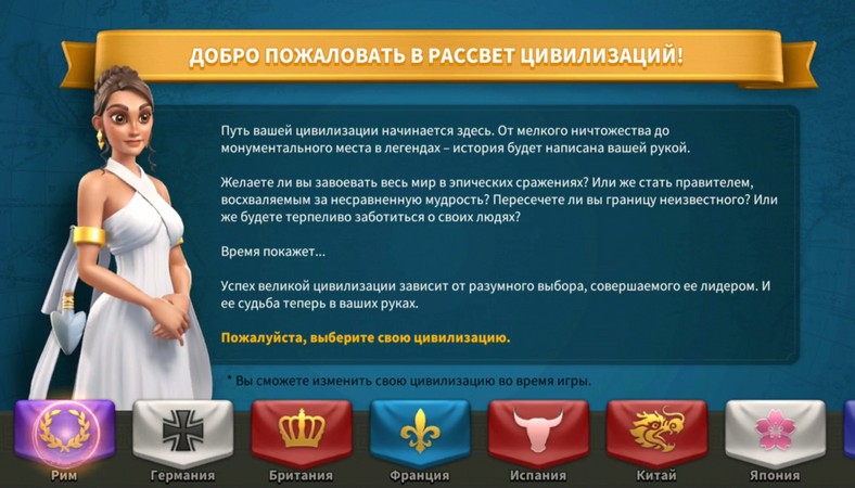 Rise of Civilizations – это игра без сюжета и конкретной цели. В играх подобного жанра есть только одна цель – стать круче всех. Игра мягчайшим образом вводит вас в игровой процесс и сразу радует глаз крутой рисовкой: на экране смартфона, планшета, компьютера Rise of Civilizations смотрится потрясающе. В самом начале игры вам нужно определиться с цивилизацией, которую вы будете развивать. Всего в Рассвете Цивилизаций на андроид их восемь – Рим, Британия, Испания, Германия, Франция, Китай, Япония и Корея. Если вы хотите просто попробовать играть в Рассвет Цивилизации, то особо запариваться с выбором нации не стоит, если же хотите со старта разобраться с особенностями каждой цивилизации, то вам стоит прочитать наш гайд по выбору наций в игре Рассвет Цивилизации. После выбора вам покажут кинематографический ролик, который настроит вас на боевой лад: вы увидите эпические сражения, качественно прорисованные 3D-модели, послушаете профессиональную озвучку и крутое музыкальное сопровождение. С презентацией игры разработчики справились на пять с плюсом. А вот дальше начинается суровый мир Rise of Civilizations…![]()