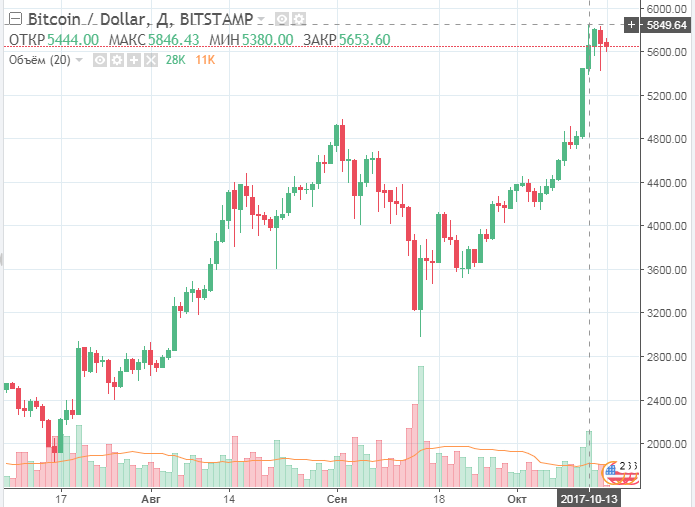После резкого снижения на бирже криптовалют в сентябре 2017 года биткоин не сдал позиции. Уже 13 октября, практически через месяц после обвала, цена за 1 биткоин составила 5700 долларов. Биткоин не только восстановил прежнюю стоимость, но и приумножил её, практически на 1000 долларов.