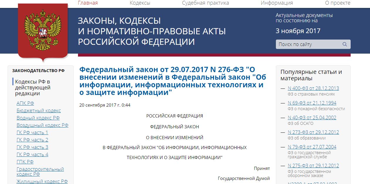 В РФ вступил в силу законопроект, на основании которого такие приложения как VPN, Tor и анонимайзеры оказались под запретом. Летом 2017 года было принято положение, касающееся работы VPN и анонимайзеров. Согласно новому законопроекту, такие ресурсы должны начать совместную работу с государственной информационной системой, которая содержит список всех запрещенных сайтов для ограничения к ним доступа. Если VPN, Tor и анонимайзеры не будут сотрудничать с Роскомнадзором, то они сами окажутся в черном списке и работа с ними будет блокироваться.