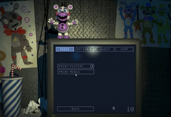 Вы проходите этот уровень и вас ждет первый напряженный момент в ФНАФ 6. Вы сидите в темной комнате напротив аниматроника. Он не двигается, вокруг только темнота и стол, на котором лежит диктофон. Вам нужно просто нажать на Play и ждать. После того как этот эпизод закончится, вас ждет довольно долгая заставка. В ней говорится о том, что вам предоставилась уникальная возможность купить себе пиццерию Freddy Fazbear’s Pizzeria. Прибыль с этого бизнеса получать довольно легко, но нужно соблюдать ряд правил: продукты всегда должны быть свежими, детей нужно развлекать, интерьер должен быть веселый, а меню понятным. Однако в конце вас ждет странное предупреждение: “Вы приняты на работу. Надеемся, что вы выживете”. Вот именно после этого и начинается настоящий FNAF 6. Вам выдают бонус в 100 долларов, на который вы должны купить предметы интерьера для вашей пиццерии. Каждый предмет – мини-игра, которая хранит в себе массу секретов. Скупились, переходите непосредственно в пиццерию и расставляйте предметы. Вы можете поиграть в мини-игры, но они никак не влияют на сюжет – это простое зарабатывание денег и влияния (чем больше ваш рейтинг влиятельности, тем больше детей приходят в Freddy Fazbear’s Pizzeria). Немного наигравшись в мини-игры, вы попадаете в привычную комнату охранника из предыдущих частей FNAF. Правда, в ФНАФ 6 она называется немного по-другому – это кабинет управляющего.